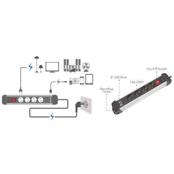 Fyra uttag, två USB-portar, och en inbyggd brytare ger fullständig kontroll över strömförsörjningen. Den 1.5m långa kabeln och monterbara designen ökar flexibiliteten.