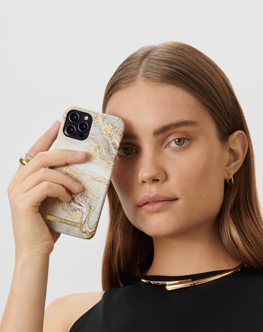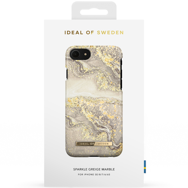 Här har du ett modeorienterat skal från iDeal of Sweden till iPhone SE2/8/7/6S/6 i designen Sparkle Greige Marble. Designen framkallar bilder av sanddynor som dansar över virvlande marmormönster. Med hjälp av en organisk och naturlig design för det tankarna till att slappn av i en dröm av underbara semesternyanser. Ett lätt guldskimmer ligger strött till sanden oc ger en glittrande slutfinish.