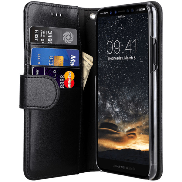 Plånboksfodral i en stilren, klassisk och detaljerad design vilket ger din iPhone X/XS ett trendigt utseende och känsla av mode och fashion. Inbyggd med tre kortfickor och en till för sedlar på insidan. Välarbetad produkt som är tillverkad för hand med en telefonhållare av ett tåligare slag, samtliga knappar och portar är lätta att använda. Skyddar hörnen, fram- och baksidan från slitage, stötar, repor och sprickor som inträffar när du använder mobilen i olika miljöer.